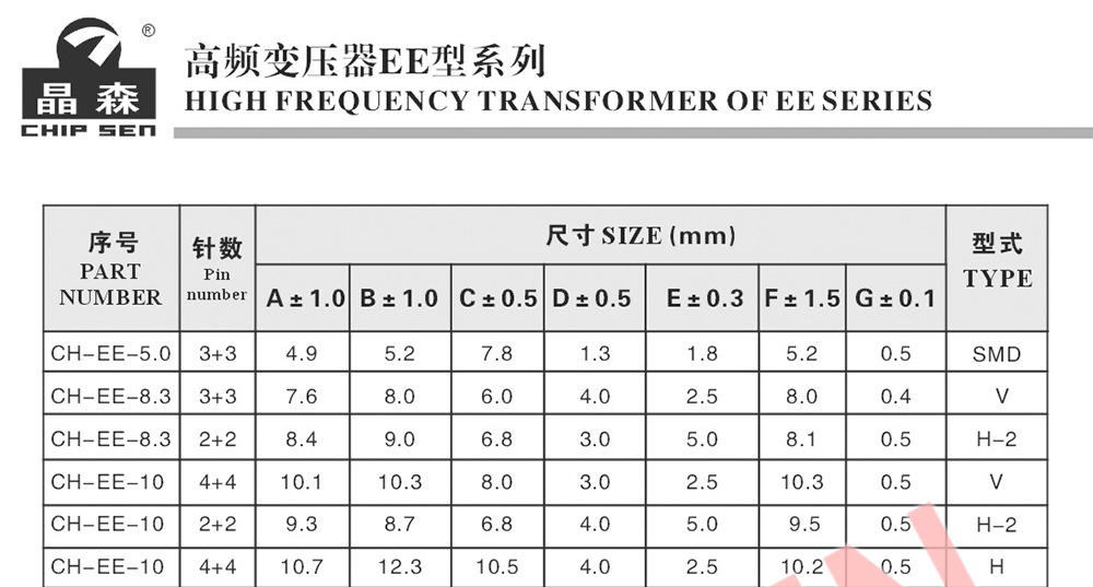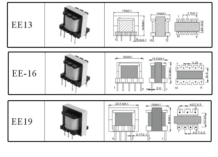 EE5/0.6W, EE8.3/2W, EE10/5W, EE12.8/7W, EE13/8-16W, EE16/10-15W, EE19/14-24W, EE22/20W, EE25/33-60W, EE28/60W, EE30/90W, EE32/95W, EE33/120W, EE34/100W, EE35/90-125W, EE40/175W,EE42/265-350W, EE55/660-800W, EE65/900-1250W, EE70/1500W