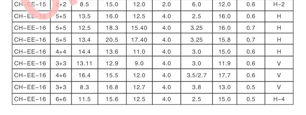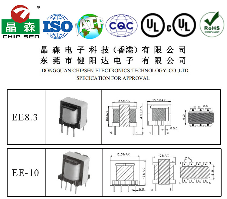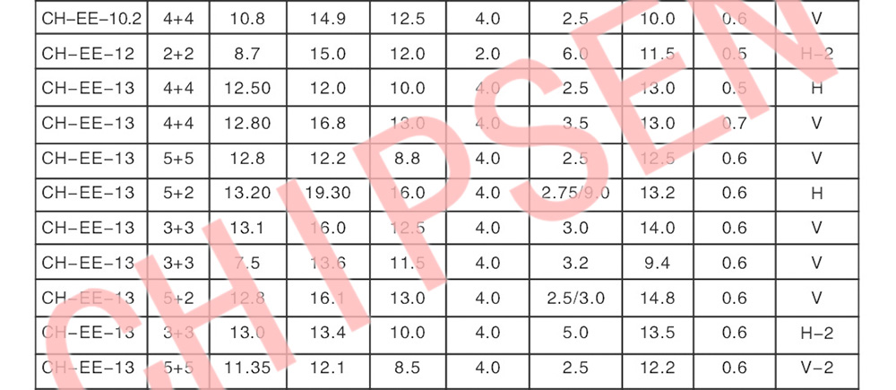 EE5/0.6, EE8.3/2, EE10/5, EE12.8/7, EE13/8-16, EE16/10-15, EE19/14-24, EE22/20, EE25/33-60, EE28/60, EE30/90, EE32/95, EE33/120, EE34/100, EE35/90-125, EE40/175,EE42/265-350, EE55/660-800, EE65/900-1250, EE70/1500